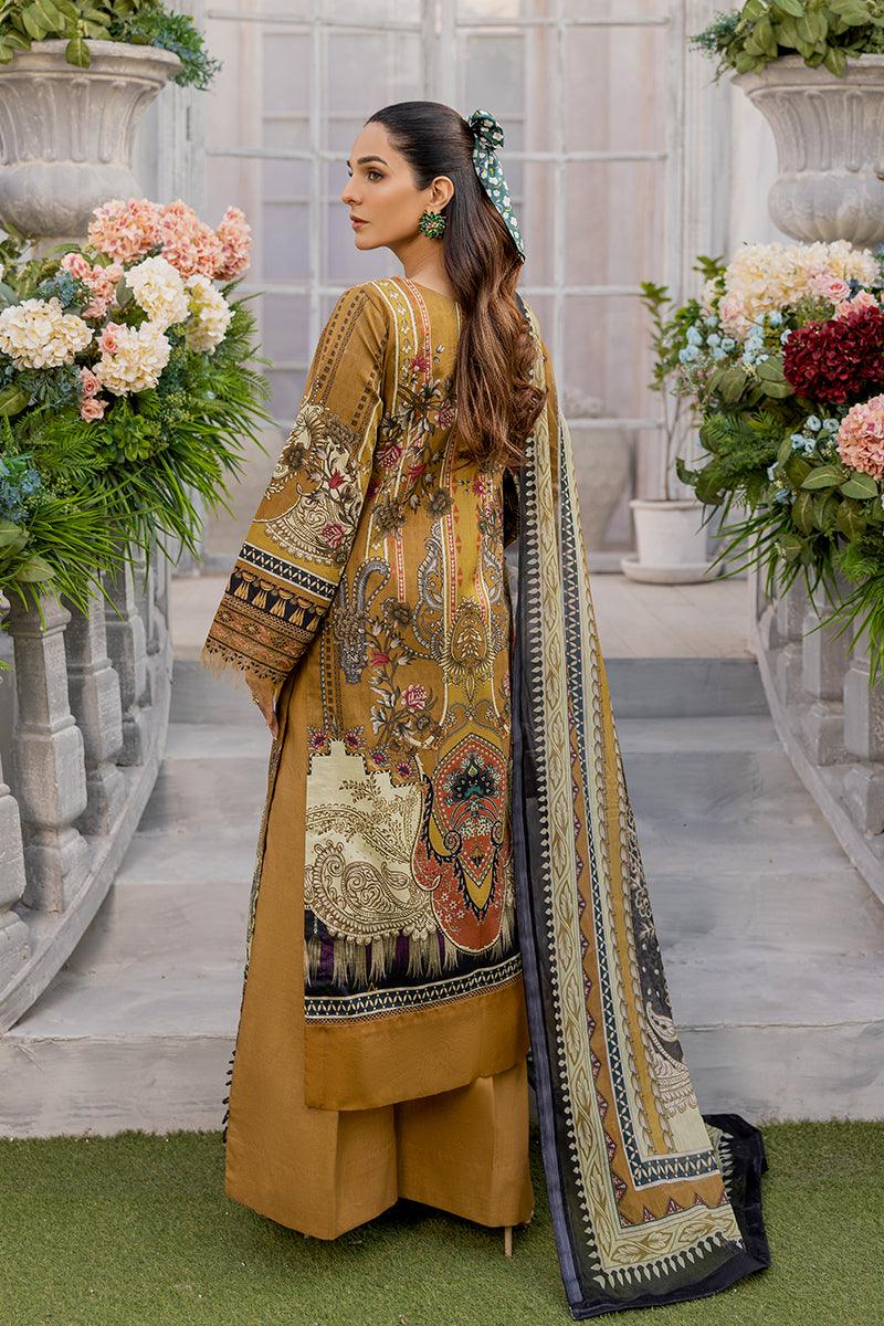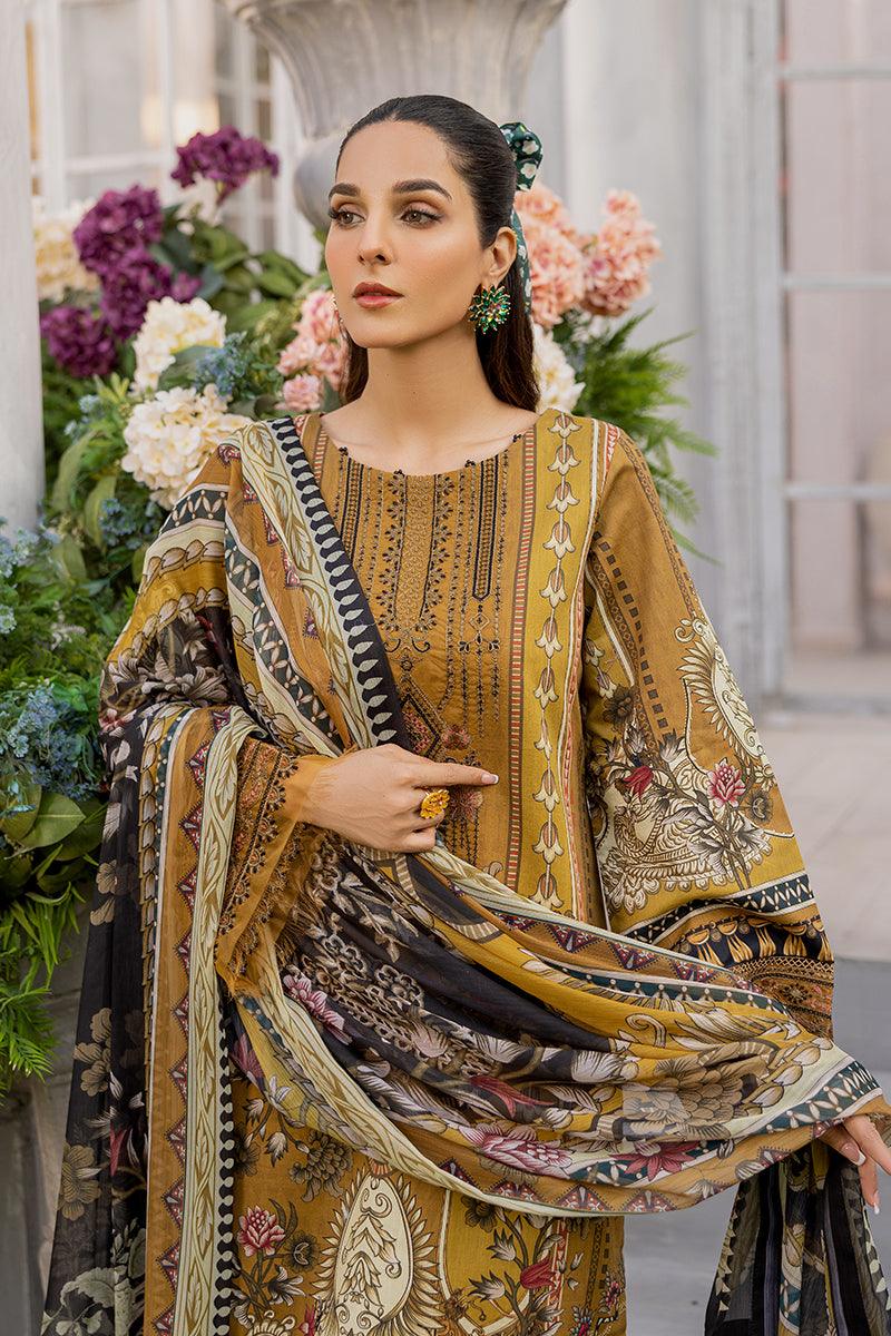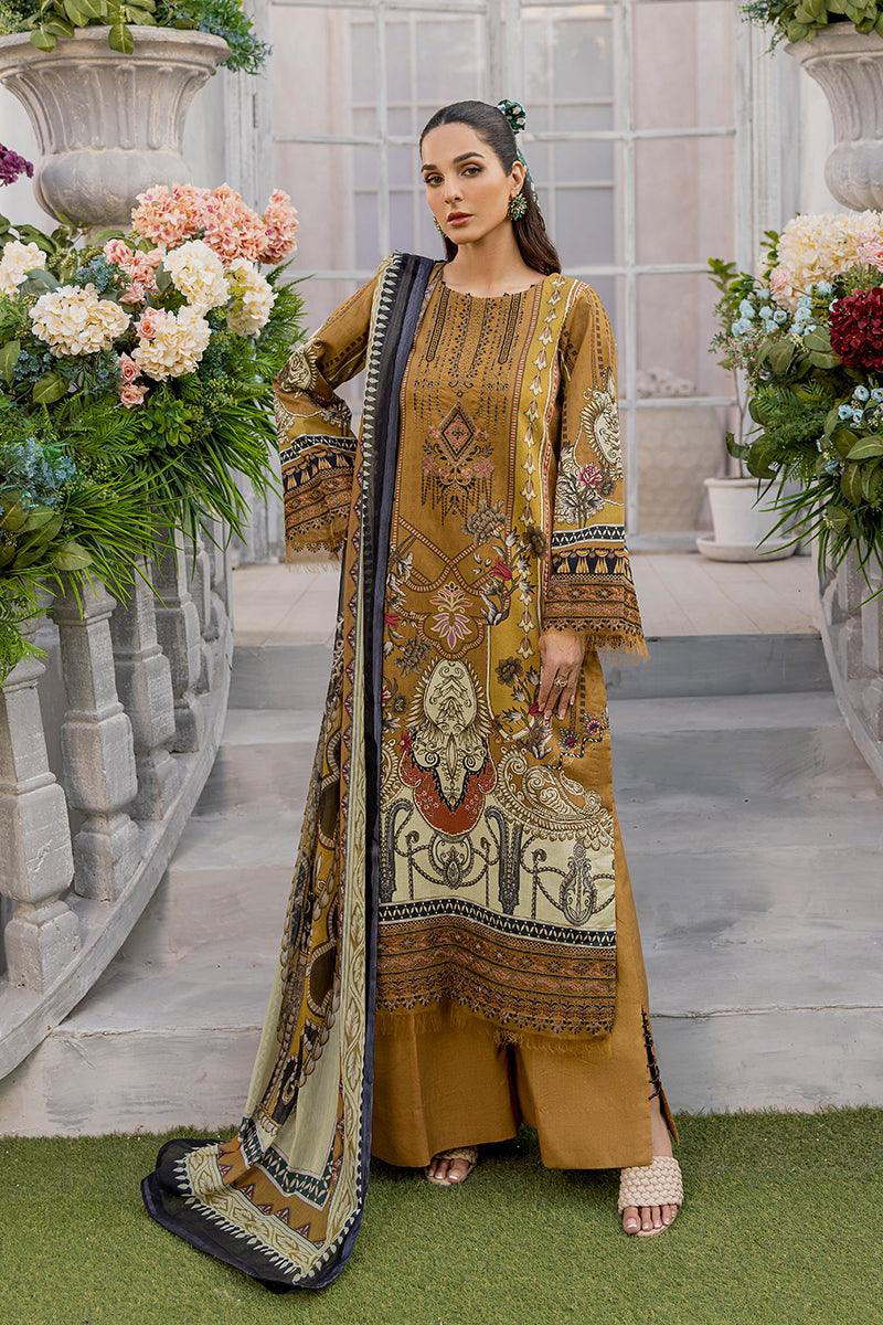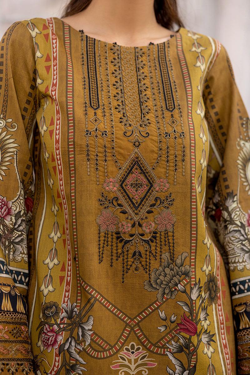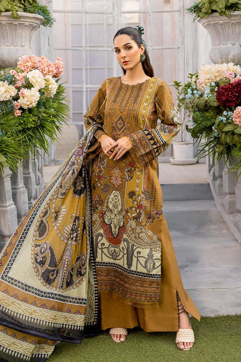 Additional Description: Digitally printed lawn shirt Digitally printed chiffon dupata Same shirt colour cotton lawn trouser Embroidered organza motif for front neckline Embroidered organza border for shirt front Embroidered organza border for sleeves